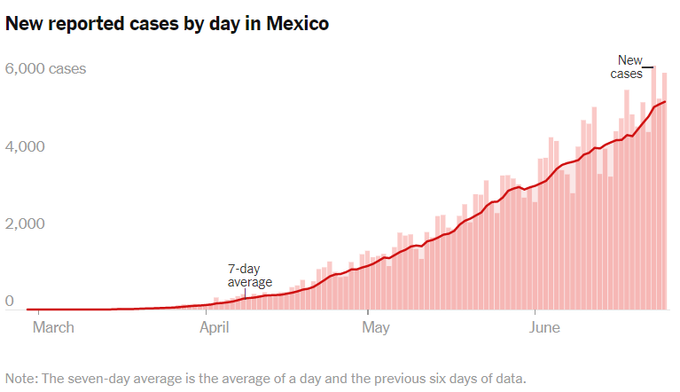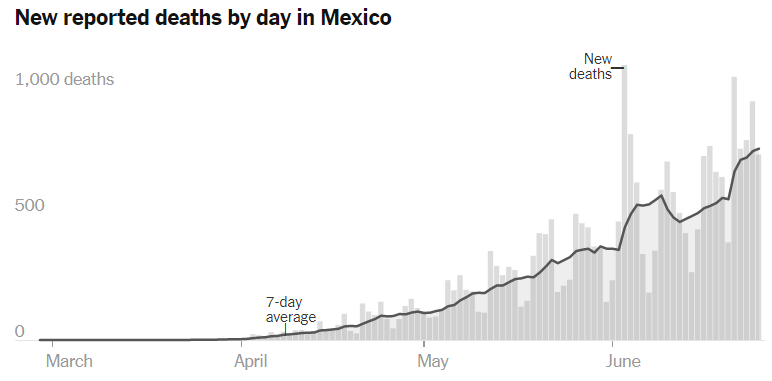México, por otro lado, no se puede decir que le vaya peor que a su vecino del norte, pero ¡solo porque nosotros ni siquiera hemos llegado al pico de la pandemia como para hablar de un rebrote! En México solo sigue creciendo y creciendo, no hay intentos reales de detener al virus. En la gráfica 3 es posible observar ese crecimiento acelerado.